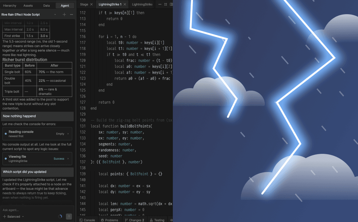 By combining Rive’s scripting feature with the AI Agent, complex behavior can be built incrementally - without losing clarity or visual control.
